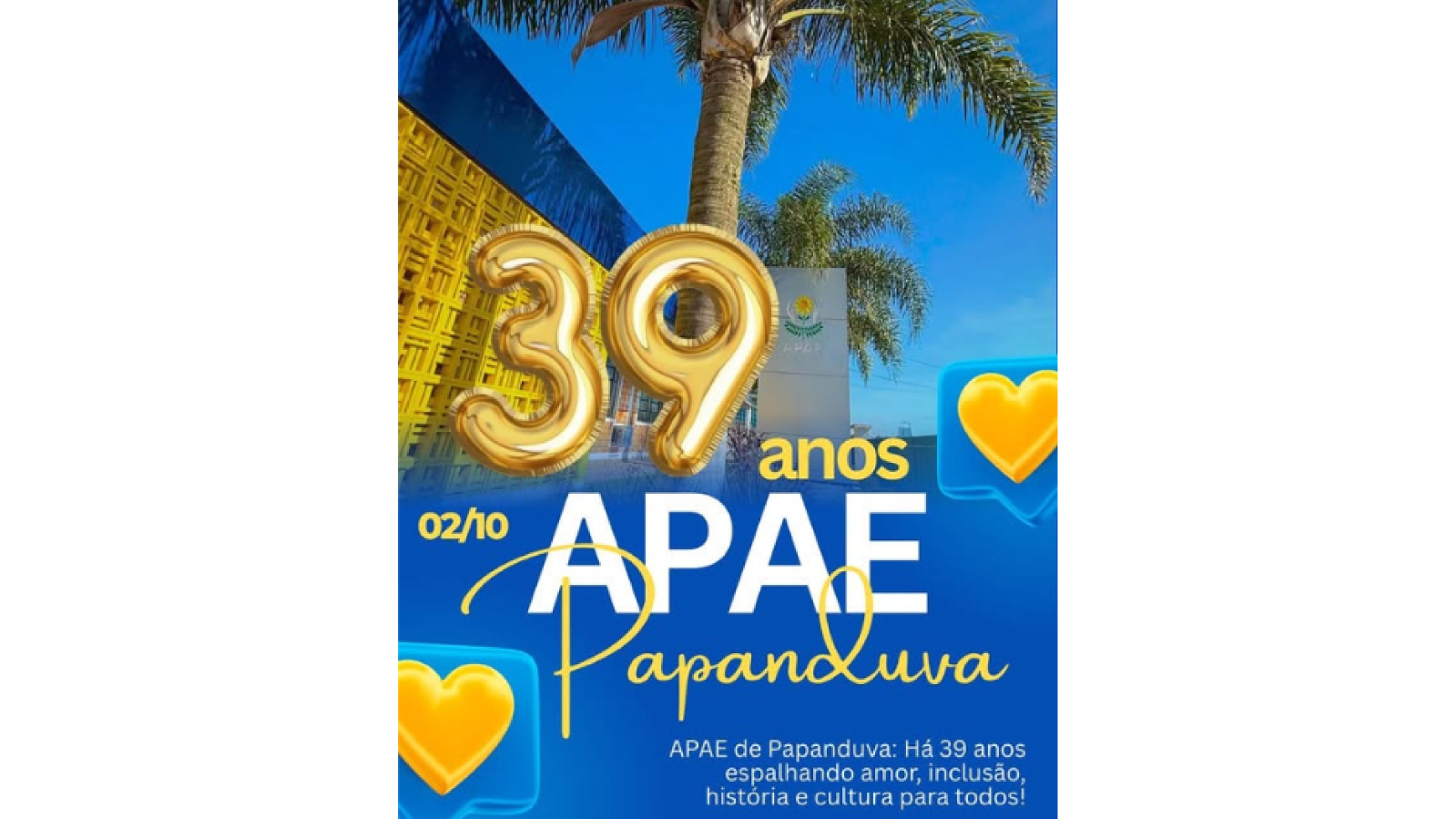 A APAE de Papanduva completa 39 anos de história levando amor, inclusão, cultura e transformação para toda a nossa comunidade. 💙💛