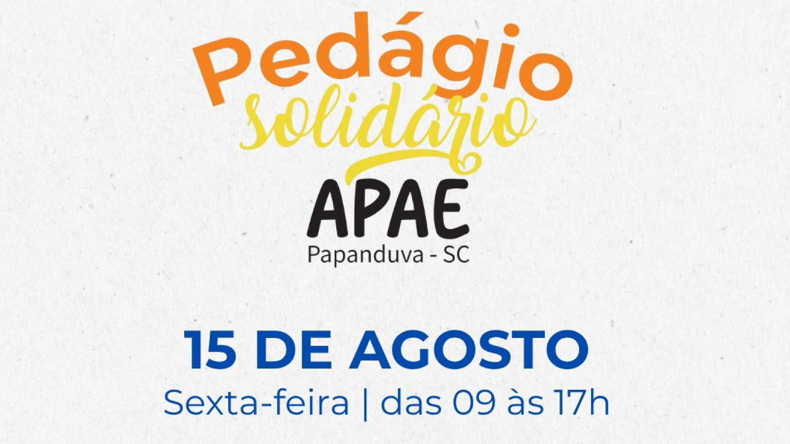 No dia 15 de agosto, a APAE de Papanduva convida você para um gesto cheio de significado: ✨ Participar do nosso Pedágio Solidário, das 9h às 17h, nos principais pontos da cidade!